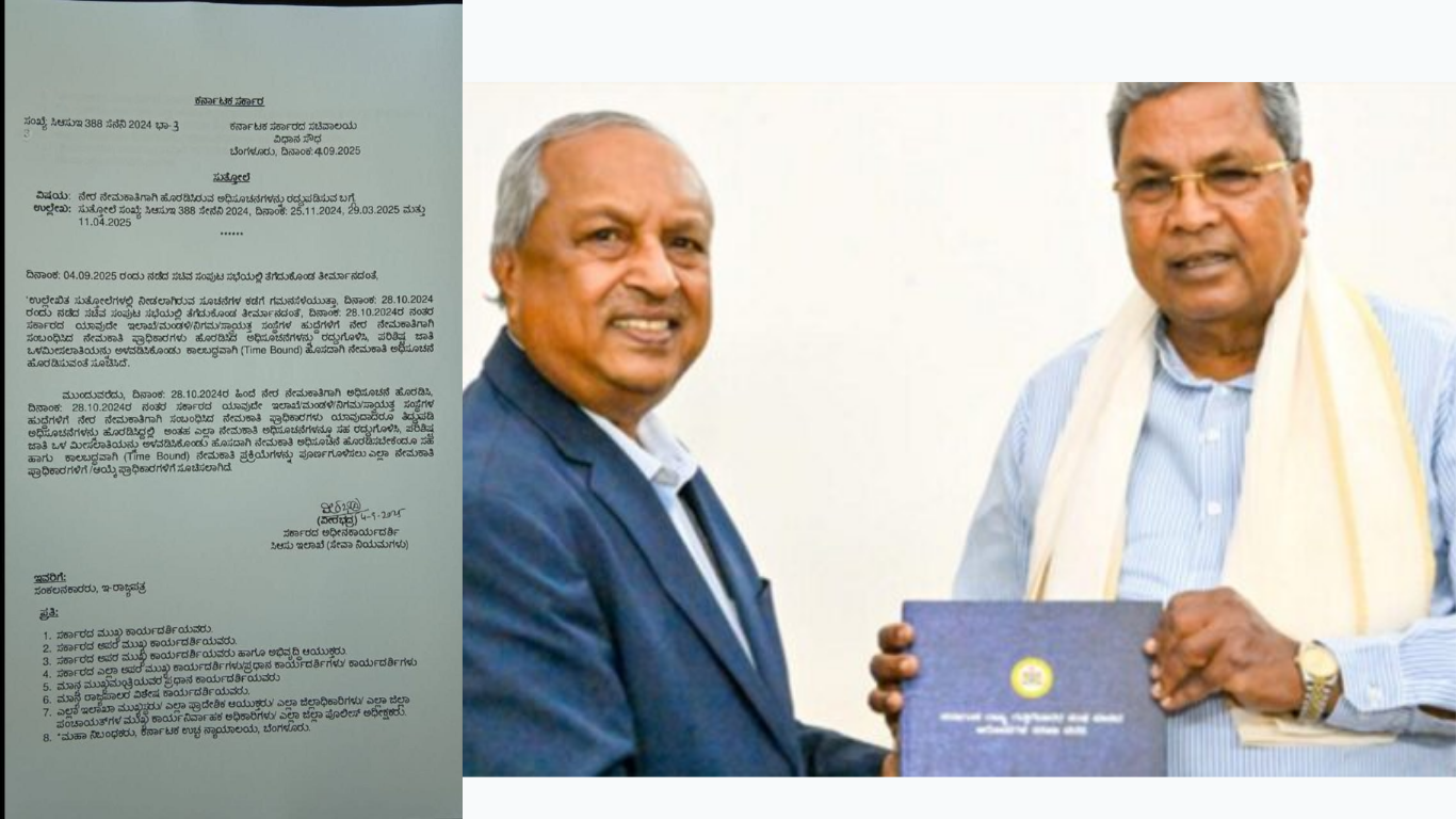 ದಿನಾಂಕ 04-09-2025 ರಂದು ನಡೆದ ಸಚಿವ ಸಂಪುಟ ಸಭೆಯಲ್ಲಿ ತೆಗೆದುಕೊಂಡ ತೀರ್ಮಾನದಂತೆ ಉಲ್ಲೇಖಿತ ಸುತ್ತೋಲೆಗಳಲ್ಲಿ ನೀಡಲಾಗಿರುವ ಸೂಚನೆಗಳ ಕಡೆಗೆ ಗಮನ ಸೆಳೆಯುತ್ತಾ, ದಿನಾಂಕ 28 10.2024 ರಂದು ನಡೆದ ಸಚಿವ ಸಂಪುಟ ಸಭೆಯಲ್ಲಿ ತೆಗೆದುಕೊಂಡ ತೀರ್ಮಾನದಂತೆ ದಿನಾಂಕ 28-10-2024 ರ ನಂತರ ಸರ್ಕಾರ ಯಾವುದೇ ಮಂಡಳಿ, ನಿಗಮ, ಸ್ವಯಕ್ತ, ಸಂಸ್ಥೆಗಳ, ಹುದ್ದೆಗಳಿಗೆ ನೇರ ನೇಮಕಾತಿಗಾಗಿ ಸಂಬಂಧಿಸಿದ ನೇಮಕಾತಿ ಪ್ರಾಧಿಕಾರಗಳು ಹೊರಡಿಸಿದ ಅಧಿಸೂಚನೆಗಳನ್ನು ರದ್ದುಗೊಳಿಸಿ ಪರಿಶಿಷ್ಟ ಜಾತಿ ಮೀಸಲಾತಿಯನ್ನು ಅಳವಡಿಸಿಕೊಂಡು ಕಾಲಬದ್ಧವಾಗಿ ಹೊಸದಾಗಿ ನೇಮಕಾತಿ ಹರಿಸೂಚನೆ ಹೊರಡಿಸುವಂತೆ ಸೂಚಿಸಿದೆ.