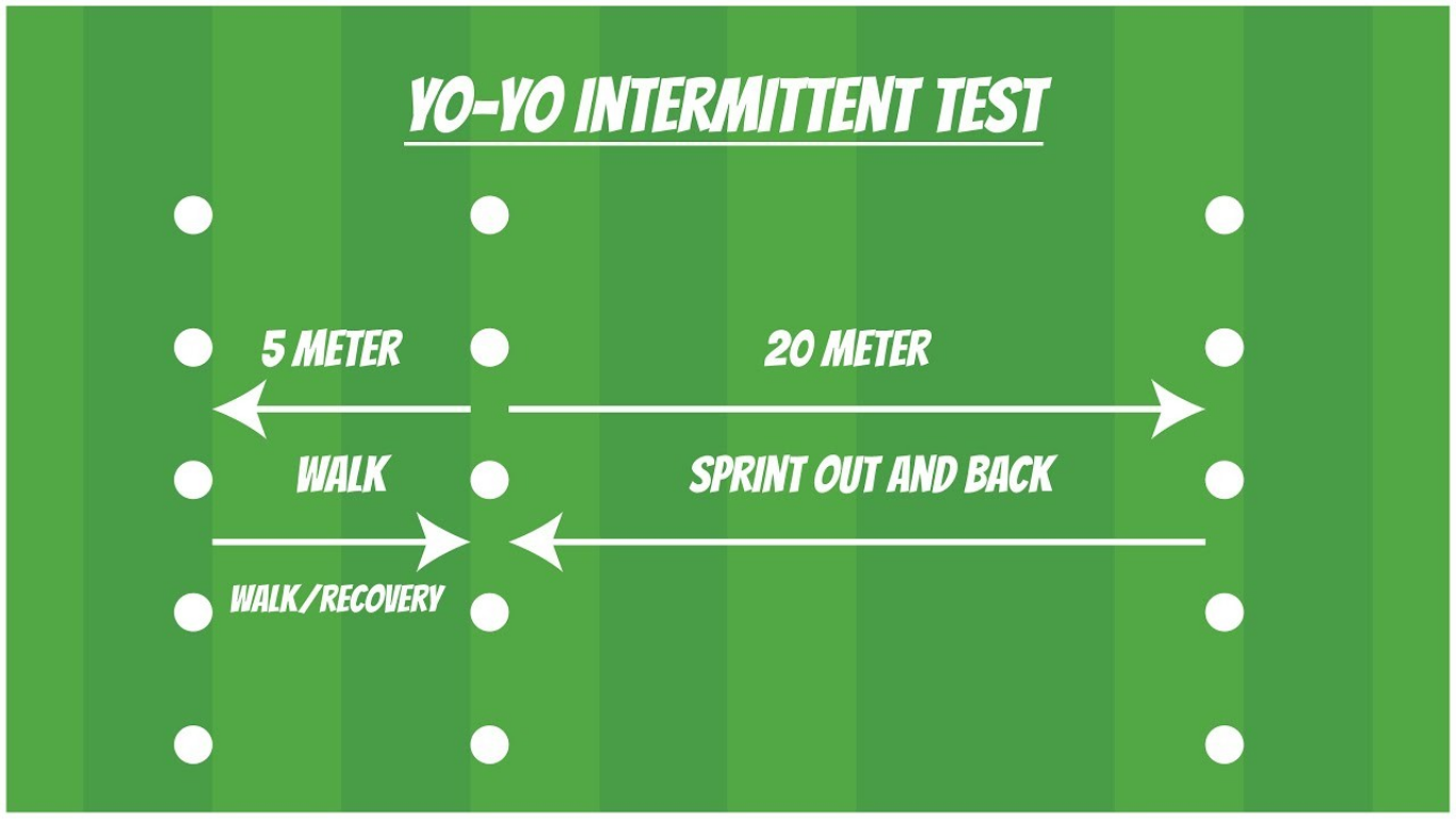 ವಿವರಣೆ: ಯೋ-ಯೋ ಇಂಟರ್ಮಿಟೆಂಟ್ ರಿಕವರಿ ಟೆಸ್ಟ್ ಆಟಗಾರರ ಏರೋಬಿಕ್ ಫಿಟ್ನೆಸ್, ಸಹಿಷ್ಣುತೆ, ಮತ್ತು ಚೇತರಿಕೆ ಸಾಮರ್ಥ್ಯವನ್ನು ಮೌಲ್ಯಮಾಪನ ಮಾಡುತ್ತದೆ. ಆಟಗಾರರು 20 ಮೀಟರ್ ಶಟಲ್ ಓಟವನ್ನು ವೇಗದಲ್ಲಿ, ಕಡಿಮೆ ವಿಶ್ರಾಂತಿ ಅವಧಿಯೊಂದಿಗೆ ನಡೆಸುತ್ತಾರೆ.