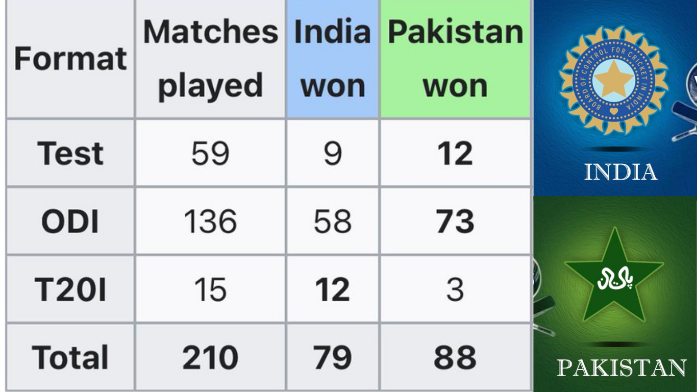 ಭಾರತ-ಪಾಕಿಸ್ತಾನ ಕ್ರಿಕೆಟ್ ಸ್ಪರ್ಧೆಯು ಕ್ರೀಡೆಯಲ್ಲಿ ಅತ್ಯಂತ ತೀವ್ರವಾದ ಮುಖಾಮುಖಿಯಲ್ಲಿ ಒಂದಾಗಿದ್ದು, 1952 ರಲ್ಲಿ ಮೊದಲ ಪಂದ್ಯದಿಂದಲೂ ಈಗಿನವರೆಗೆ, 70 ವರ್ಷಗಳಿಗಿಂತ ಹೆಚ್ಚು ಕಾಲಾವಧಿಯನ್ನು ಒಳಗೊಂಡಿದೆ. ಕೆಳಗೆ ಮೂರು ಅಂತರರಾಷ್ಟ್ರೀಯ ಫಾರ್ಮ್ಯಾಟ್ಗಳಲ್ಲಿ ಪಂದ್ಯಗಳ ಸಾರಾಂಶ ನೀಡಲಾಗಿದೆ.