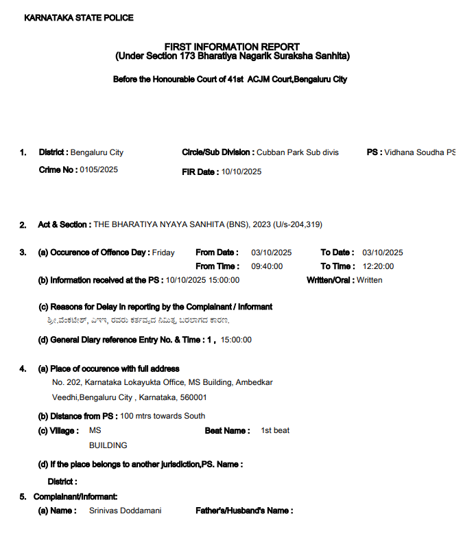 ಅನುಮಾನಗೊಂಡ ಅಧಿಕಾರಿಗಳು ಲೋಕಾಯುಕ್ತ ಕಚೇರಿಗೆ ಬಂದು ಪರಿಶೀಲಿಸಿದಾಗ ನಕಲಿ ನಂಬರ್ ಎಂಬುದು ಖಚಿತವಾಗಿದ್ದು, ಆ ಕೂಡಲೇ ಲೋಕಾಯುಕ್ತ ಅಧಿಕಾರಿಗಳಿಗೆ ತಿಳಿಸಿದ್ದಾರೆ ಎನ್ನಲಾಗಿದೆ. ಅಕ್ಟೋಬರ್ 10 ರಂದು ಪ್ರಕರಣ ದಾಖಲಾಗಿದ್ದು, ಈ ಕುರಿತ ಕ್ರಮ ಕೈಗೊಳ್ಳಲು ಕಾನೂನಾತ್ಮಕವಾಗಿ ಪೋಲಿಸರು ತನಿಖೆ ನಡೆಸಿದ್ದಾರೆ ಎನ್ನಲಾಗಿದೆ. ಇದನ್ನೂ ಓದಿ: ಮನೆ ಸ್ಪೋಟ ಪ್ರಕರಣ - ಸಿಲಿಂಡರ್ ಗ್ಯಾಸ್ ಸೋರಿಕೆಯೇ ಅಥವಾ ಬೇರೆ ಸ್ಟೋಟಕ ವಸ್ತುಗಳಿದೆಯೇ? - ಸಮಗ್ರ ತನಿಖೆಗೆ ಬಿಜೆಪಿ ಆಗ್ರಹ!