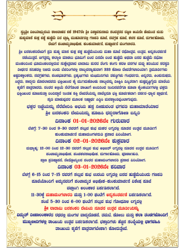 ಬೆಳಗ್ಗೆ: 7-30 ರಿಂದ 9-30 ರವರಗೆ ಸಲ್ಲುವ ಶುಭ ಮಕರ ಲಗ್ನದಲ್ಲಿ ನೂತನ ಉತ್ಸವ ಮೂರ್ತಿಗೆ ಕುಂಕುಮಾರ್ಚನೆ ಮಹಾಮಂಗಳರುತಿ ಪ್ರಸಾದ ವಿನಿಯೋಗ.