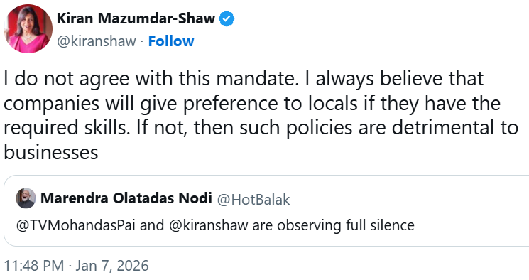 ಬಯೋಕಾನ್ ಮುಖ್ಯಸ್ಥೆ ಕಿರಣ್ ಮಜುಂದಾರ್ ಶಾ ಅವರು ಸರ್ಕಾರದ ಈ ನಿರ್ಧಾರಕ್ಕೆ ಬಹಿರಂಗವಾಗಿ ವಿರೋಧ ವ್ಯಕ್ತಪಡಿಸಿದ್ದಾರೆ. "ಉದ್ಯೋಗಕ್ಕೆ ಬೇಕಾದ ಕೌಶಲ್ಯವಿದ್ದರೆ ಕಂಪನಿಗಳು ಸ್ಥಳೀಯರಿಗೆ ಆದ್ಯತೆ ನೀಡುತ್ತವೆ. ಆದರೆ ಮೀಸಲಾತಿಯನ್ನು ಕಡ್ಡಾಯಗೊಳಿಸುವುದು ವ್ಯವಹಾರಗಳಿಗೆ ಹಾನಿಕಾರಕ," ಎಂದು ಅವರು ಅಭಿಪ್ರಾಯಪಟ್ಟಿದ್ದಾರೆ.