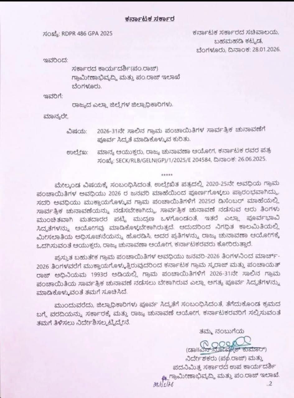 ರಾಜ್ಯದಲ್ಲಿನ ಎಲ್ಲ ಗ್ರಾಮ ಪಂಚಾಯತ್ಗಳ ಅಧಿಕಾರಾವಧಿ ಪೂರ್ಣಗೊಂಡಿರುವ ಹಿನ್ನಲೆಯಲ್ಲಿ, ಮುಂದಿನ ಚುನಾವಣೆಗೆ ಸಕಲ ಸಿದ್ದತೆ ನಡೆಸಲಾಗಿದೆ. ರಾಜ್ಯ ಸರ್ಕಾರ ಹಾಗೂ ರಾಜ್ಯ ಚುನಾವಣಾ ಆಯೋಗವು ರಾಜ್ಯದ ಎಲ್ಲಾ ಜಿಲ್ಲಾಧಿಕಾರಿಗಳಿಗೆ 2026-31 ನೇ ಸಾಲಿನ ಗ್ರಾಮ ಪಂಚಾಯತಿಗಳ ಸಾರ್ವತ್ರಿಕ ಚುನಾವಣೆಗೆ ಪೂರ್ವ ಸಿದ್ದತೆ ಮಾಡಿಕೊಳ್ಳುವ ಕುರಿತು ನಿರ್ದೇಶಿಸಿದೆ.